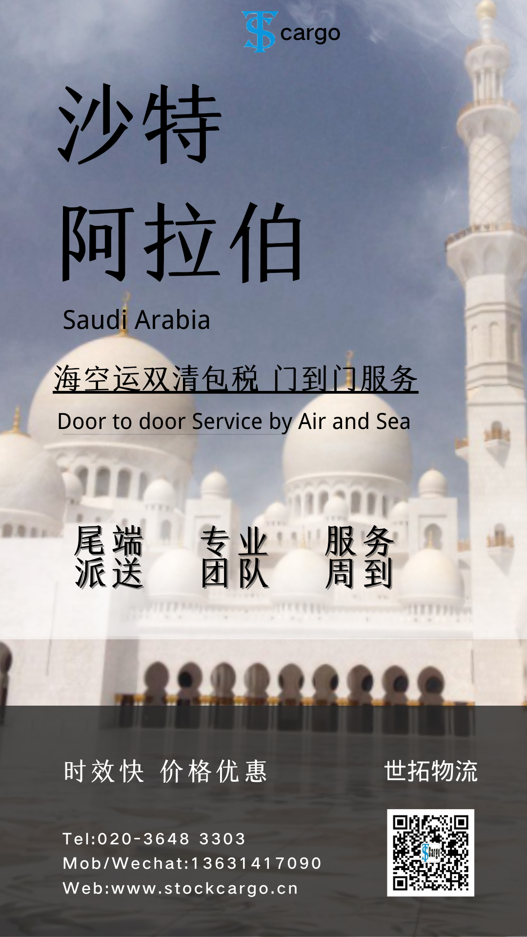 广州世拓物流专注中国-沙特空运、海运双清专线,整柜、散货拼柜、空运及国内订舱、报关拖车、国外整柜清关拖车服务,可承接各种普货,特殊货物。服务周到,速度快。